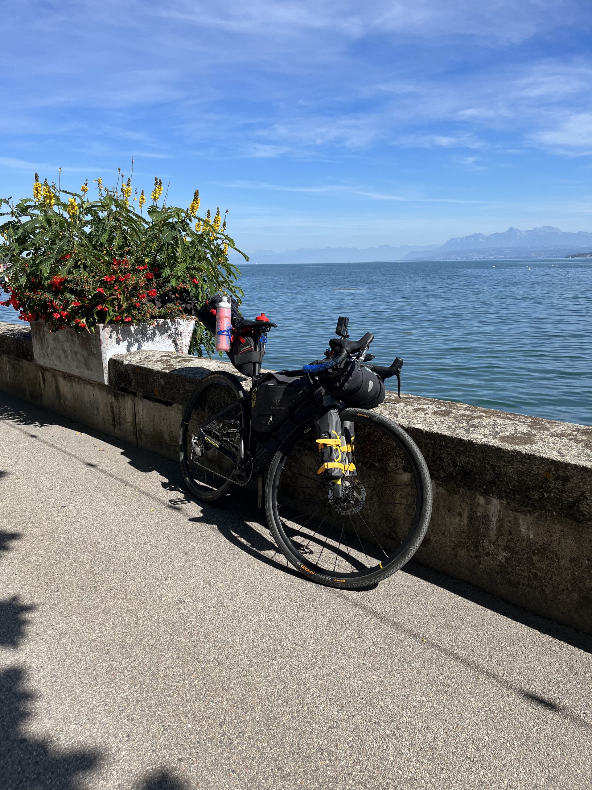 Die Strecke heute ist ca. 125 km mit 1000 Höhenmeter, bin dann relativ früh gegen 12 am Genfer See, dann gehts Richtung Genf begleitet von Clemens mit seinem 45 kg Rad, kurz vor dem Uno Gebäude trennen wir uns.
